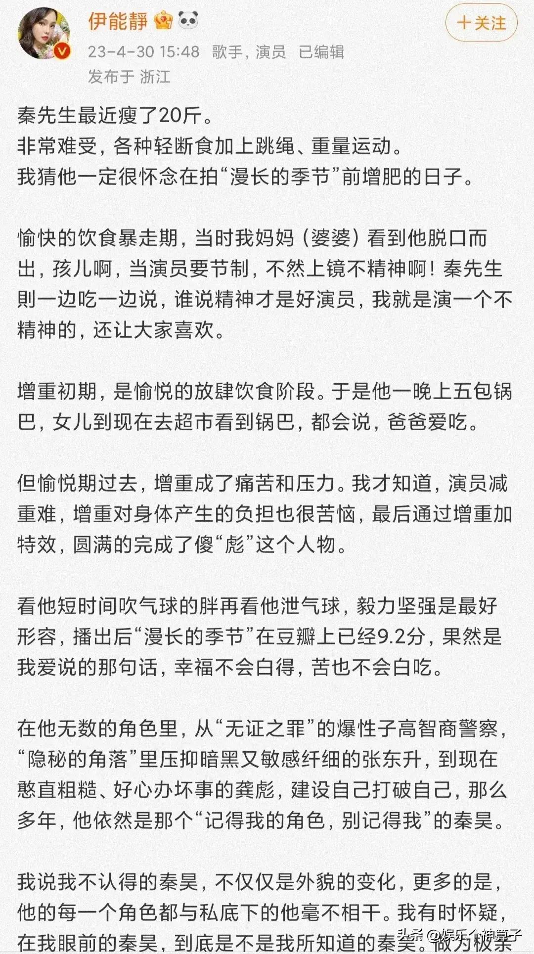 其實,伊能靜還分享過秦昊的快速瘦身的經歷,因爲出演《漫長的季節》需要快速增肥,新角色需要儘快瘦下來,每天幾乎就是喫玉米、大蝦、蔬菜,想想一個大男人,就喫這麼一點東西,簡直就是煎熬。