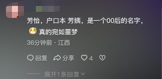 一位00後的網友表示,自己的名字叫芳怡,結果工作人員登記成了芳姨,瞬間成了60後。