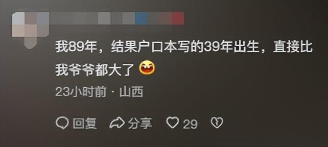 另一位網友的年齡則被登記錯了,她是89年出生的,戶口本上寫成了39年,不知道的還以爲她比她爺爺還大。