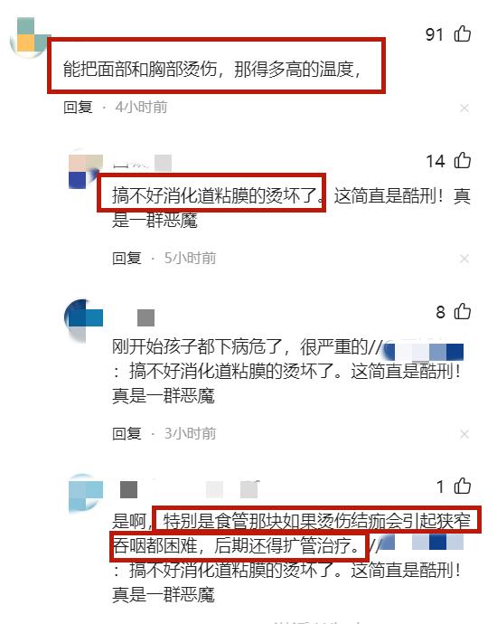 很多網友認爲趙某浩的傷情,除了大家從照片中看到的之外,可能食管和消化道黏膜都被燙壞了,而食管和消化道黏膜燙壞不容易治癒,會影響到日後的生活。