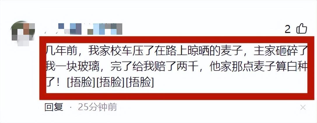 還有網友現身說法說有一年他們家的車軋到了在路上晾曬的麥子,麥子的主人將他家車的玻璃砸了,最後的結果是麥子的主人賠了他家2000元。