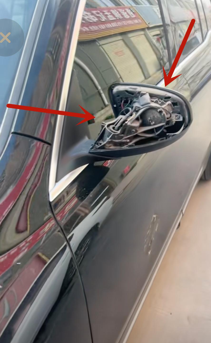 這一次,大媽成功了,後視鏡被她砸壞了。