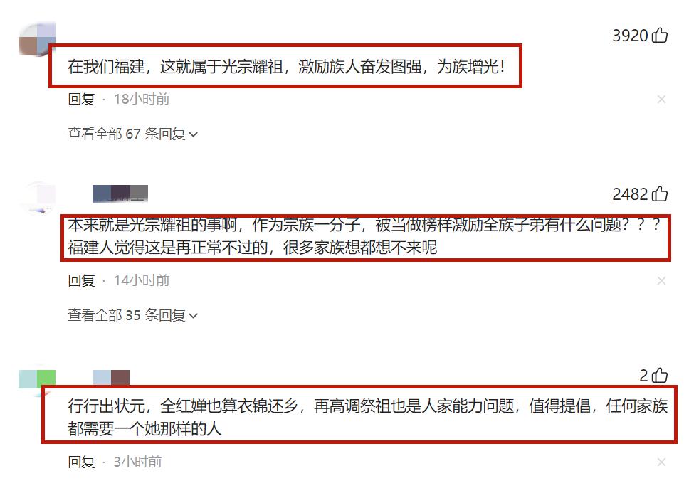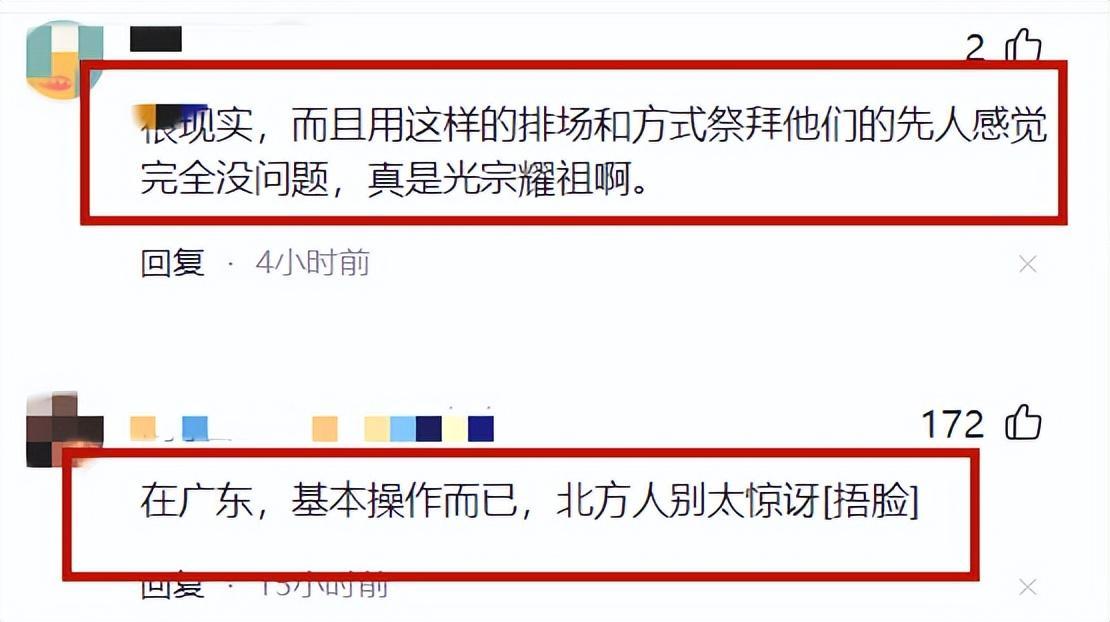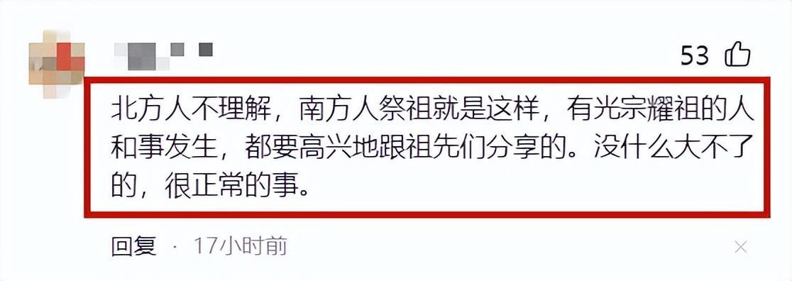 針對太高調的說法,很多南方尤其是廣東、福建的網友說不管家族有沒有出一個很厲害的人物,家族每年都會舉行隆重的祭祀活動,這已經是當地的一種民俗傳統文化。