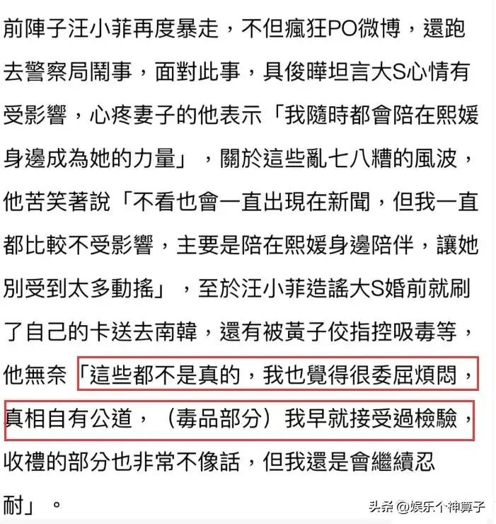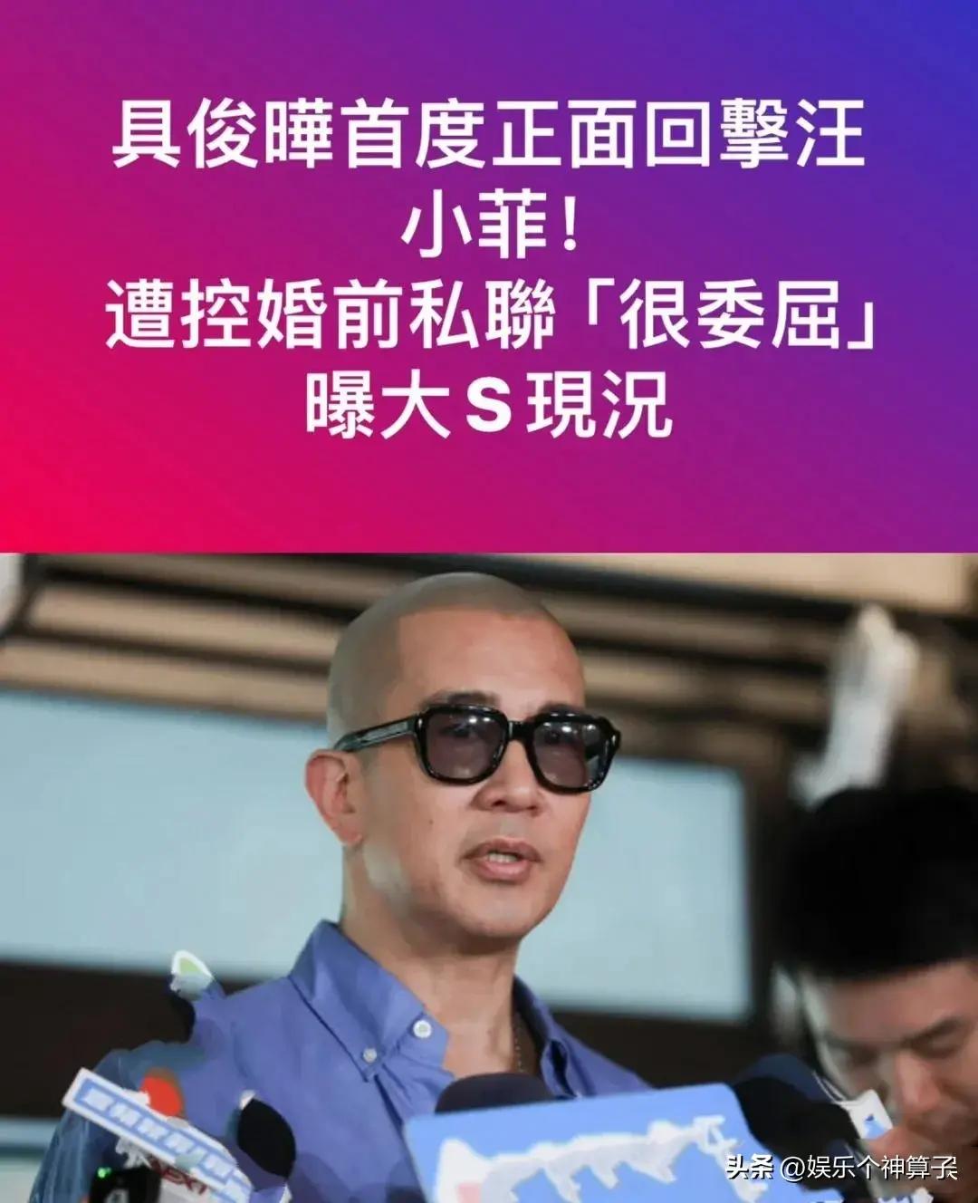 報道稱,具俊曄現場接受媒體採訪,被問及大S與汪小菲的矛盾,坦言遭爆料婚前就跟大S私下有聯繫,感到特別的委屈,不會受到汪小菲的形象,支持妻子徐熙媛,調整心態,安心的陪伴在大S身邊。