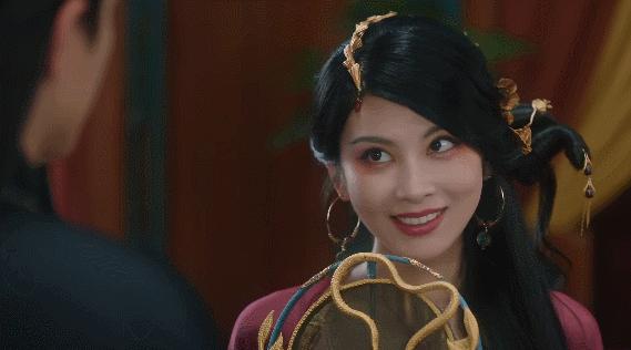 先是男裝示人,雖看似俊俏郎君,卻一點也不掩飾自己的“蛇性”,表情妖嬈嫵媚,一口一個奴家。