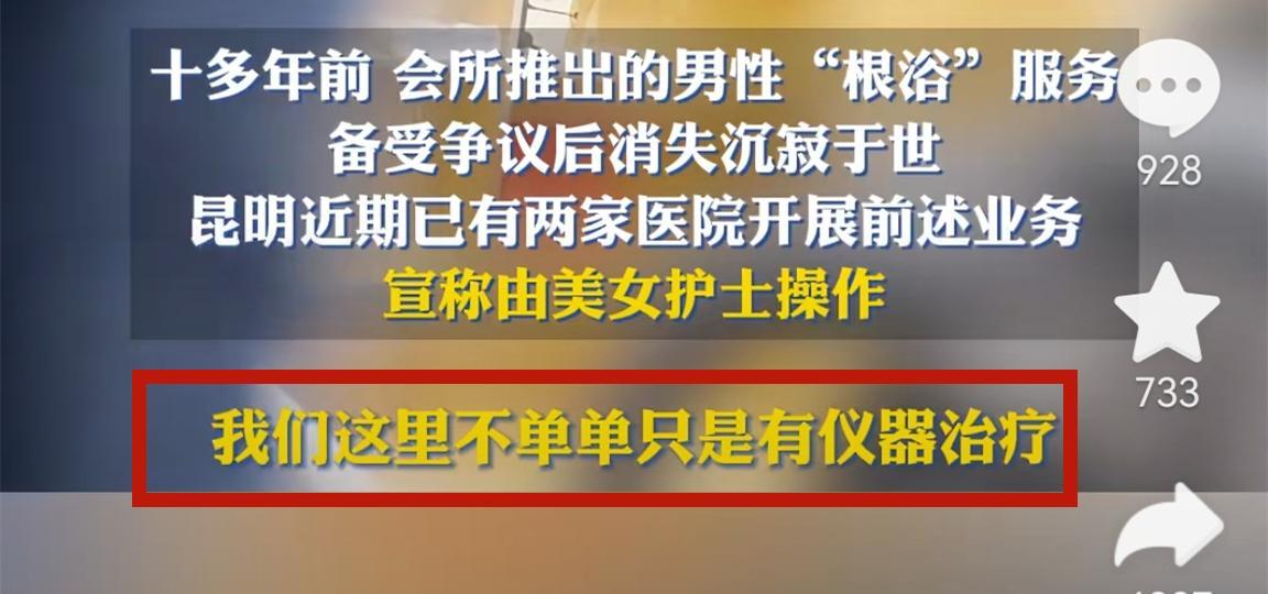 4月9日,有媒體發佈了記者到雲南昆明多家醫院暗訪男性根浴服務的視頻。