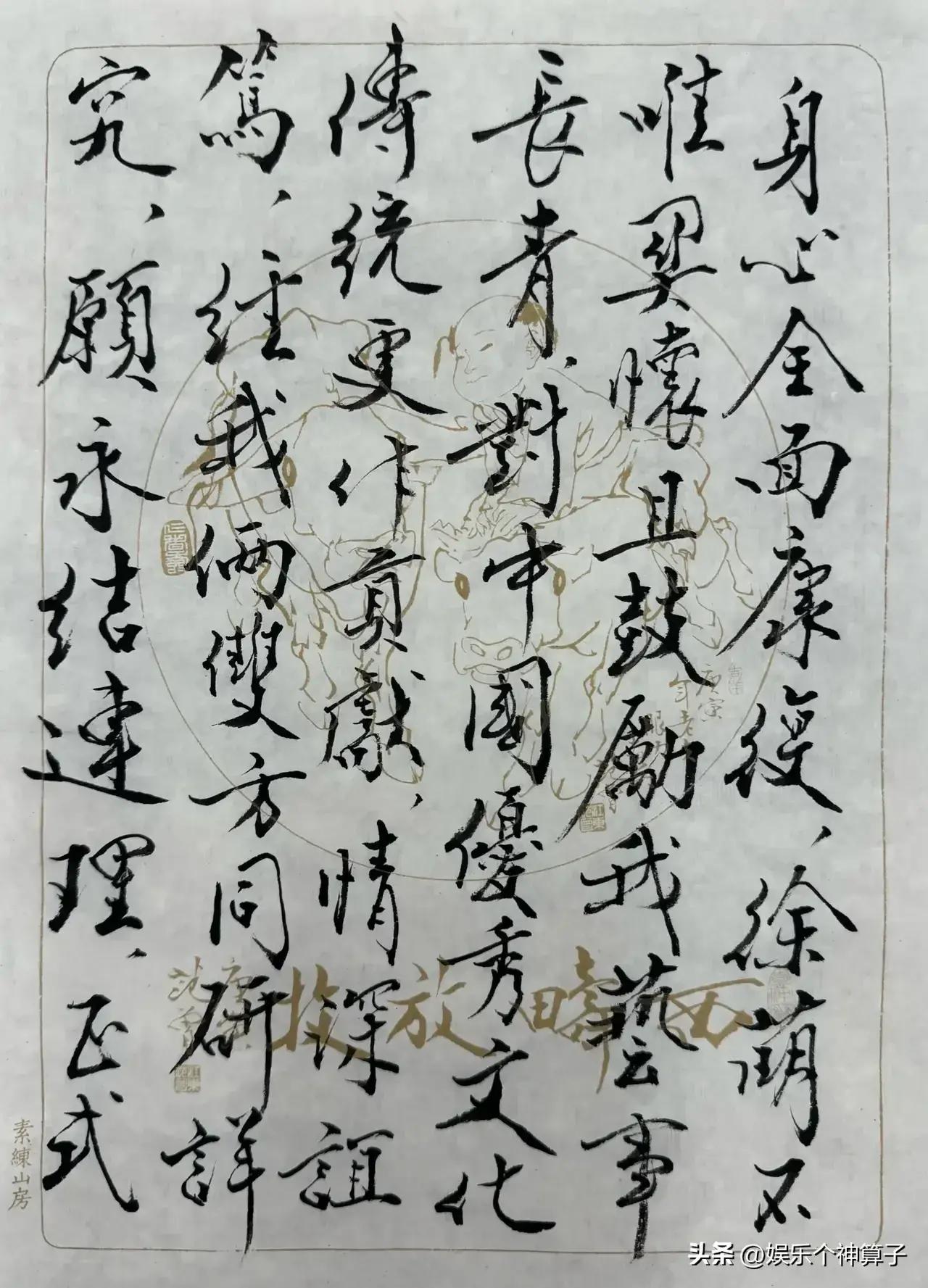 範曾把官宣的文案寫成了書法,分享給大家,不僅字很漂亮,文案也非常用心,仔細一看,正是照片中,與妻子徐萌共同完成的佳作。