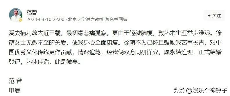 4月10日,22:00點,86歲書法家範曾仍然沒有入睡,在社交平臺發文,官宣再婚,說實話,不知爲何選在深夜宣佈喜訊,或許是想低調一點吧。