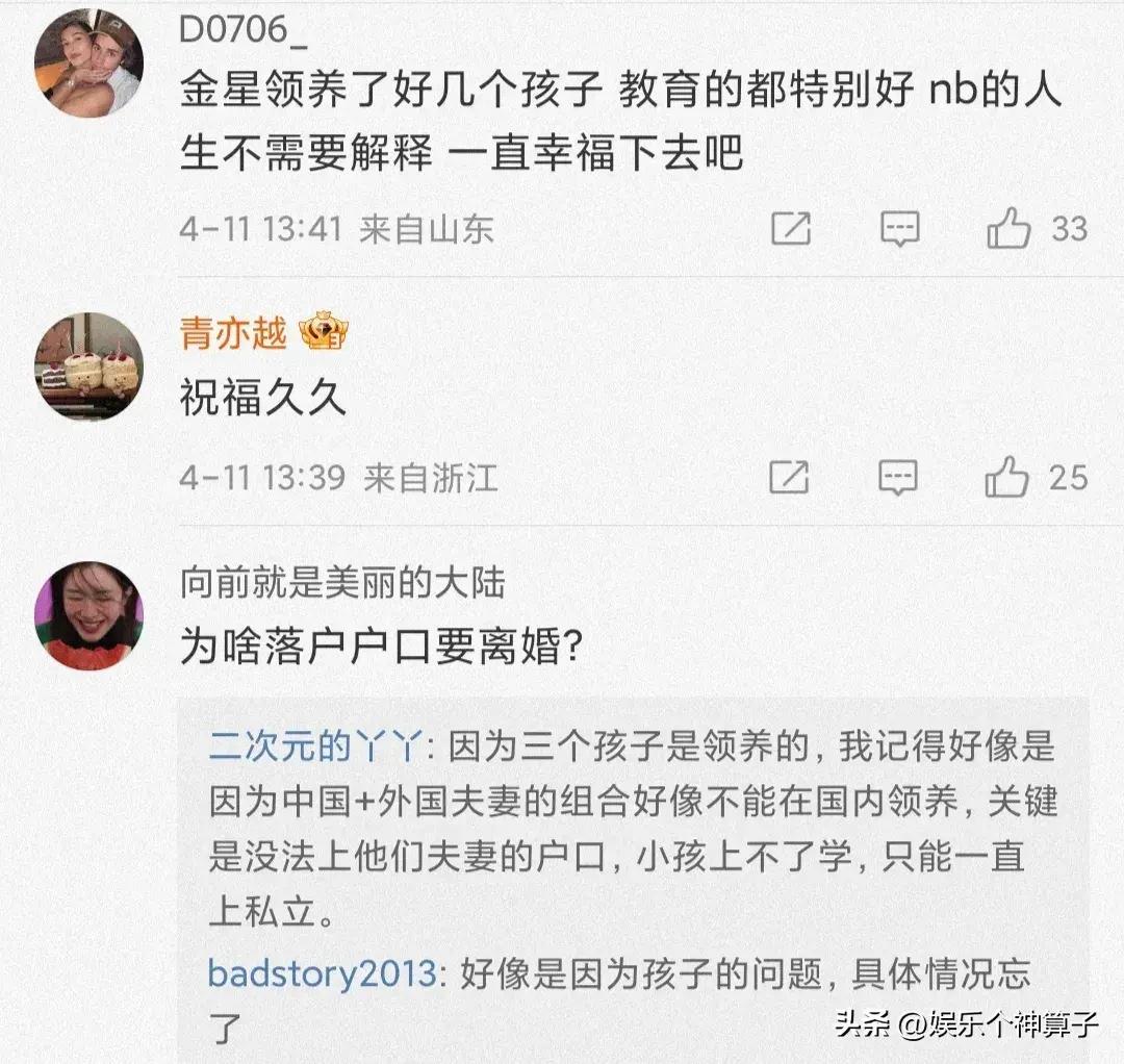 有人提出疑問,爲啥落戶口需要離婚?有網友透露,金星領養了三個孩子,夫妻國籍不同,無法上戶口,小孩不能上學,至於到底是不是這個原因,依舊不得而知。