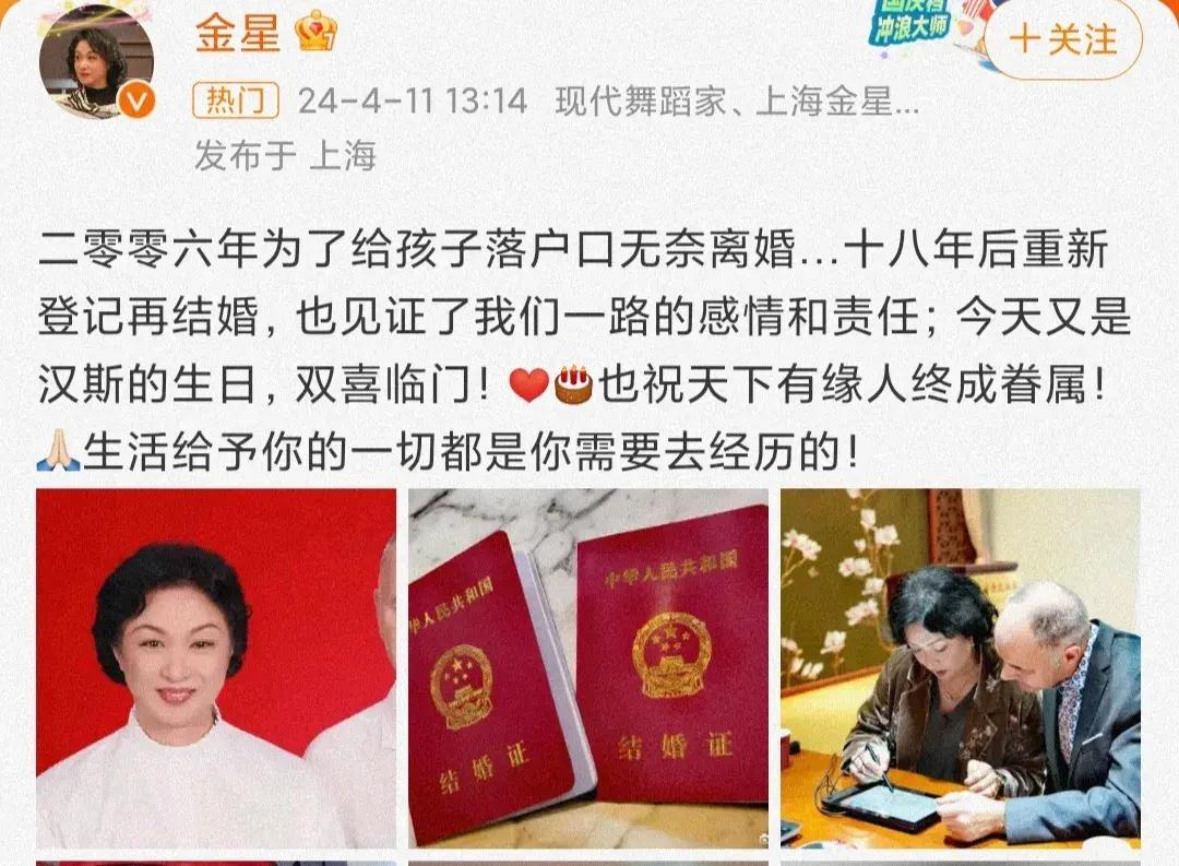 4月11日,金星登上熱搜,沒想到,這一次,一向心直口快的金姐沒有談八卦,更不是在線喫瓜,而是跟大家分享喜訊,十八年後選擇登記再結婚!