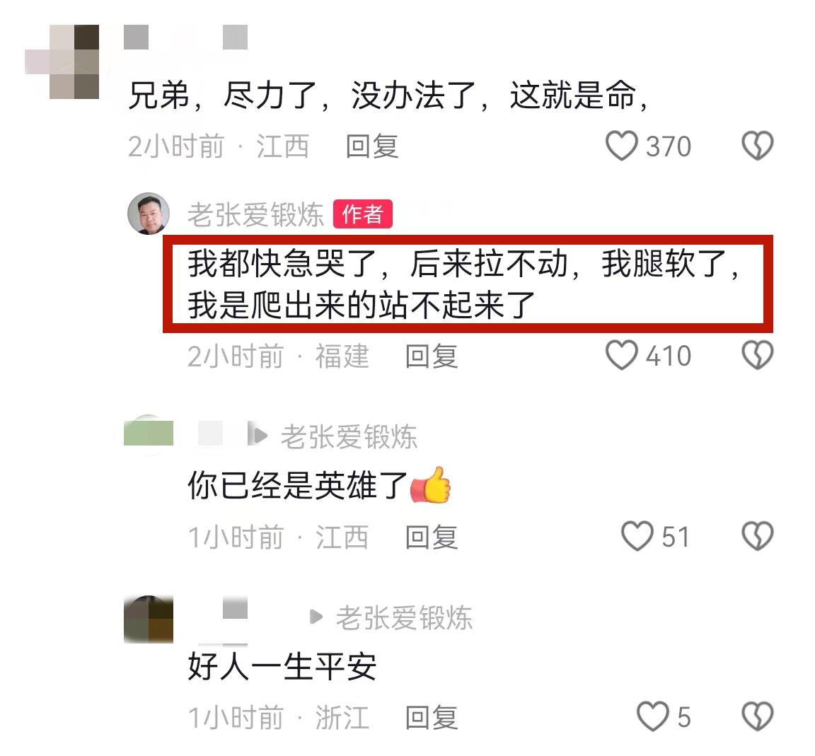 而看到這個信息的細心的網友從之前另一位網友發佈的視頻中,看到了老張的身影,大家紛紛誇他是英雄,希望他不要自責,他已經盡力了。