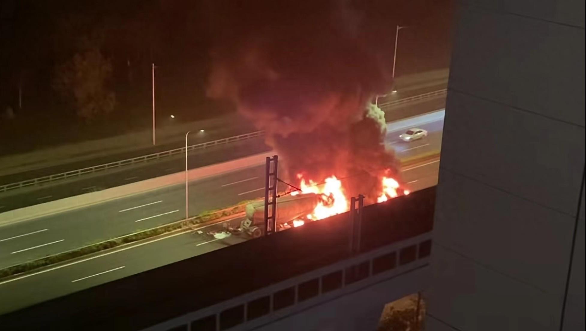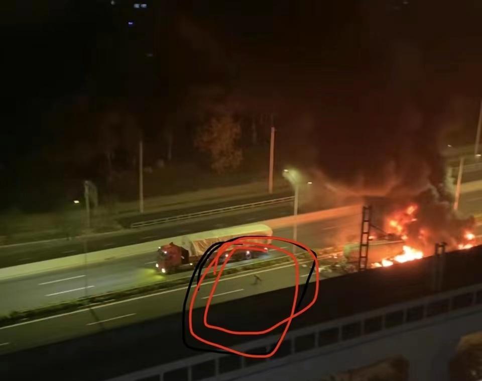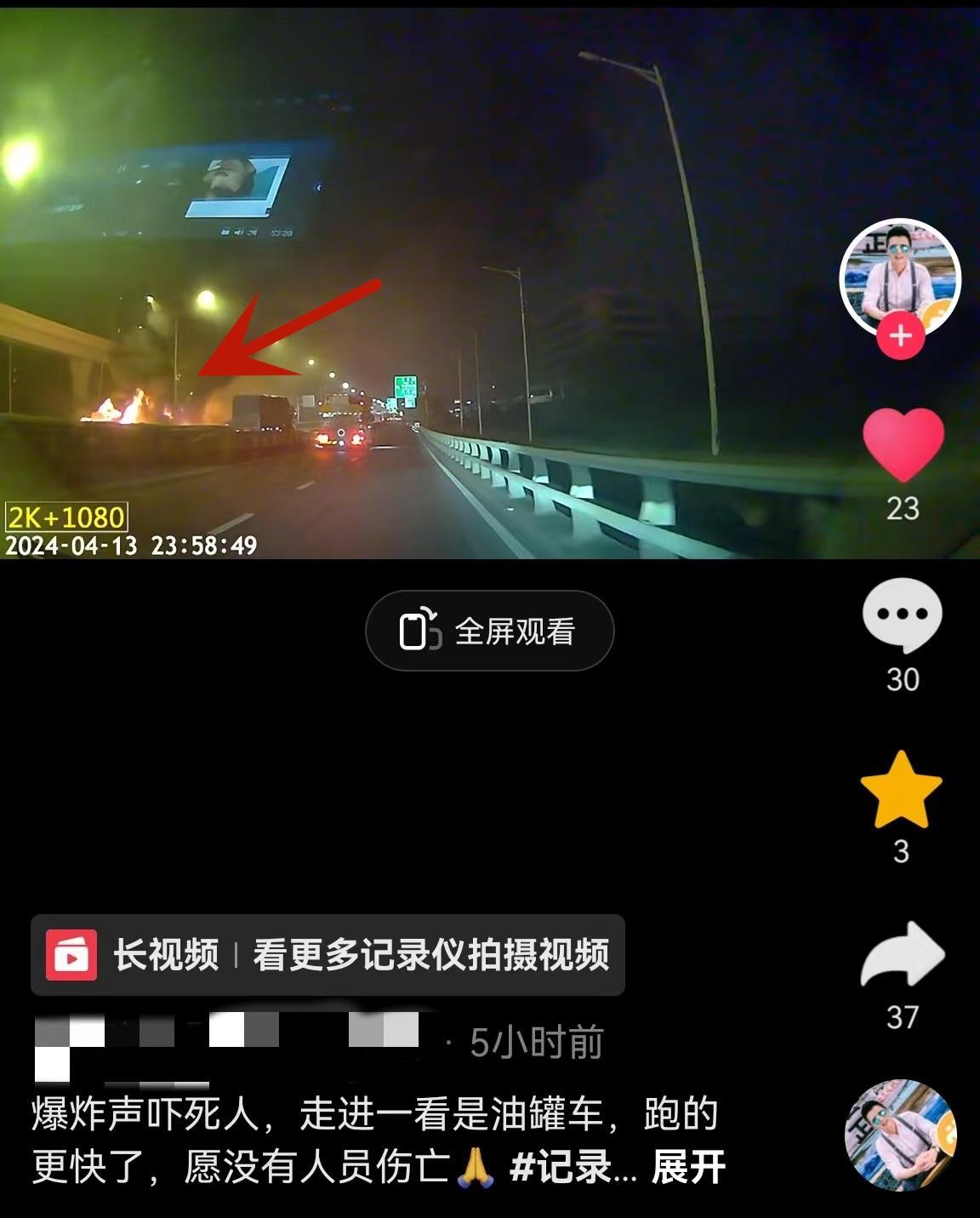 彼時該男網友駕車在另一條車道,從他的行車記錄儀視頻中可以看到,他看到油罐車時,油罐車已經着火,就在他的車離油罐車越來越近時,油罐車再次爆炸,爆炸聲將他嚇了一跳,隨即他加速遠離了油罐車。