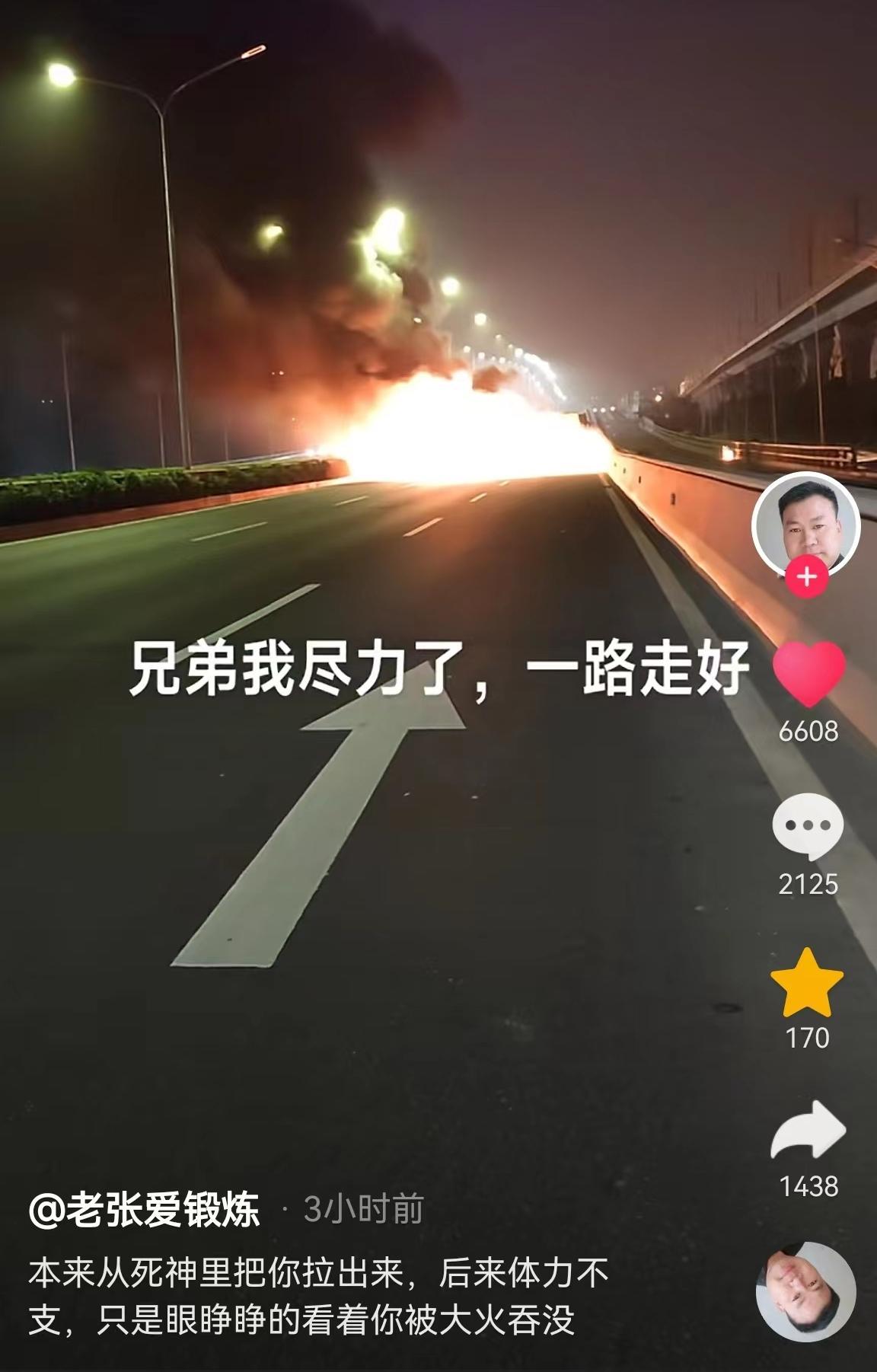 從老張拍攝的視頻中可以看到,油罐車已經被大火吞沒,他帶着哭腔說“一個活生生的人,我把他拉出來了,最後還是沒力氣,叫別人施救,別人不施救,眼睜睜的看着他被燒死了。”
