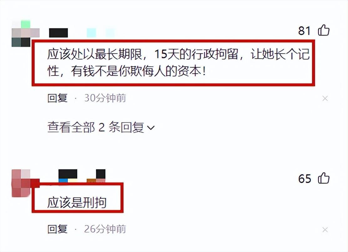 對於此,網友直呼大快人心,還有網友覺得“應該處以最長期限,15天的行政拘留,讓她長個記性,有錢不是你欺侮人的資本!”