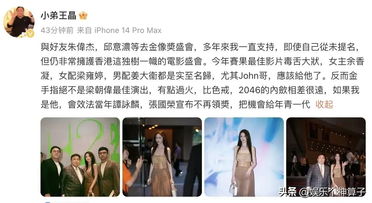 4月15日,導演王晶在社交平臺發文,表達對今年金像獎頒獎典禮的一些獨特見解,認爲最佳女主角,最佳女配角,以及最佳男配角都實至名歸。