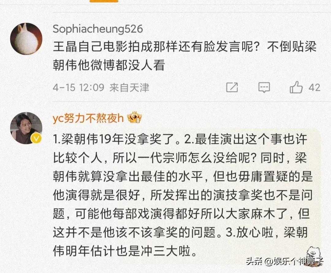 一部分網友表示贊同,覺得王晶導演特別敢說,這纔是人間清醒,梁朝偉已經多次獲獎,應該把機會留給年輕演員。