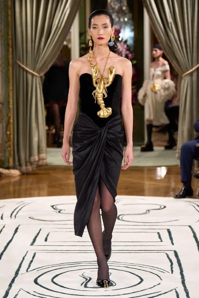 內場的黑色禮服造型就比較出挑了,這套來自Schiaparelli春夏季新晚禮服的“龍蝦裝”,感覺不是一般人的審美可以接受的。