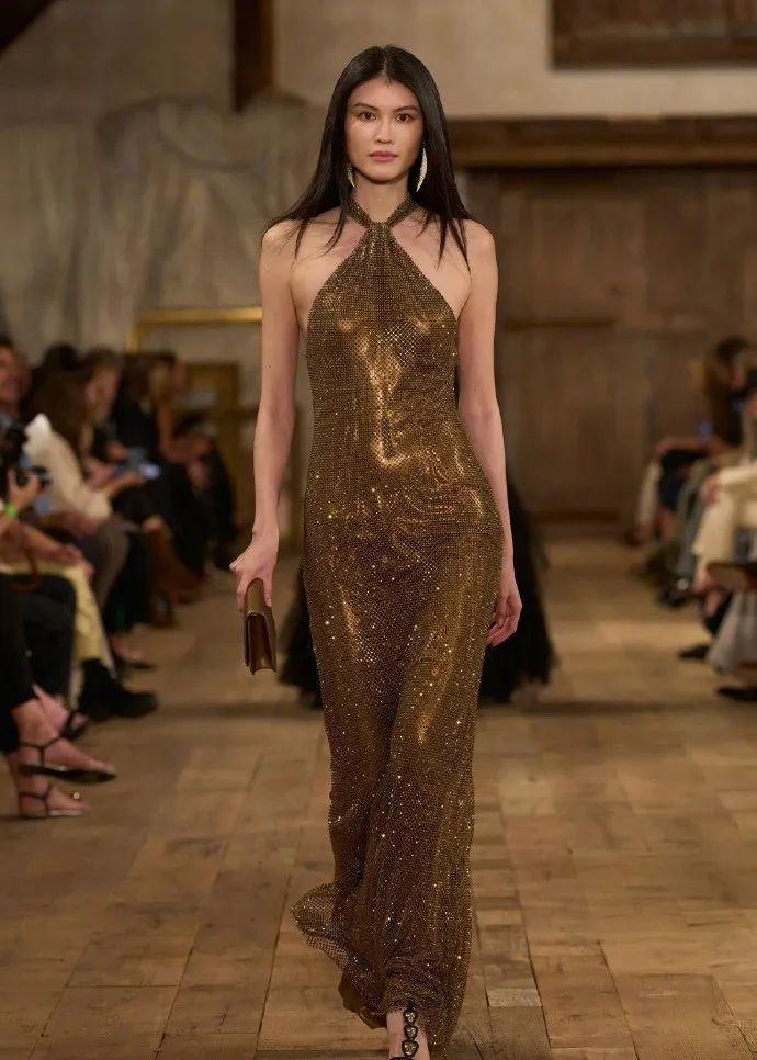 這次的禮服選的是Ralph Lauren 2024春夏系列的一套金色禮服,禮服在秀場上曾經被超模何穗穿着走過秀。