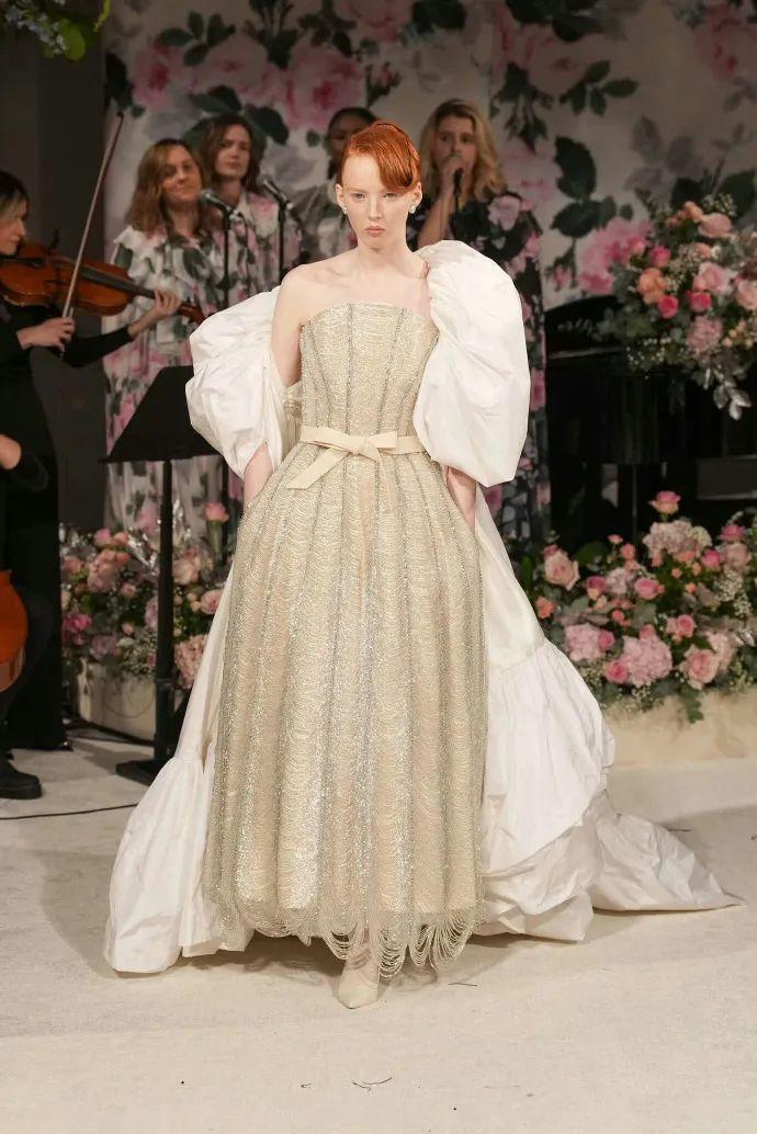 這件禮服也是走的一個立體風,抹胸的短款禮服倒不算什麼,但圍繞在禮服周圍的白色羽毛做成的造型就很有設計感。