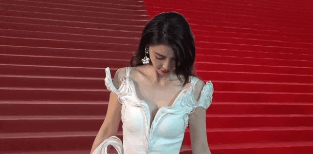 這件水藍色造型特別的禮服,身後的披風就像是一個貝殼打開的樣子,王丹妮這是直接演繹一個貝殼公主。