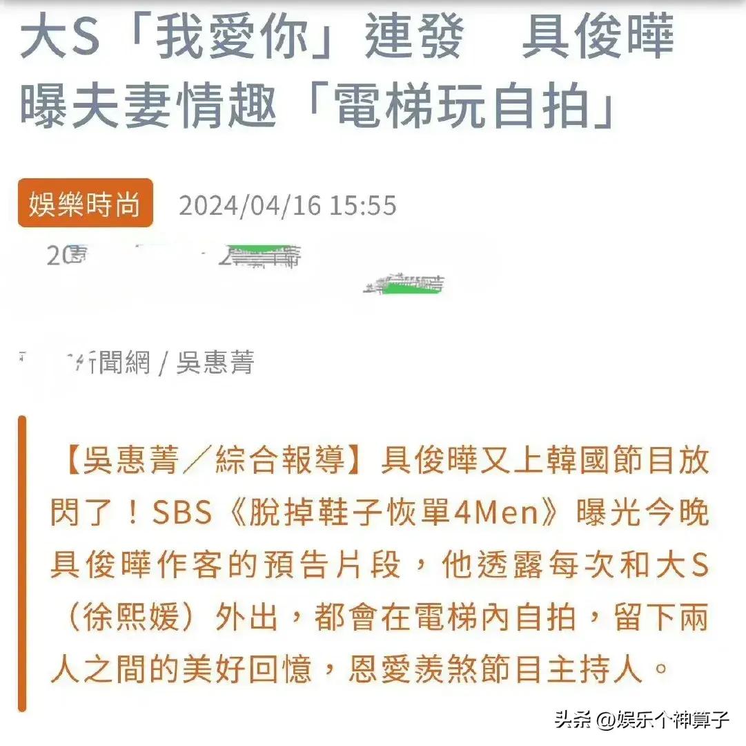 4月16日,據臺媒報道,具俊曄在韓國錄製綜藝節目,不僅曬出與大S合照,甜蜜表白妻子,還曝出夫妻情趣(電梯玩自拍),不得不說,標題一如既往的勁爆。