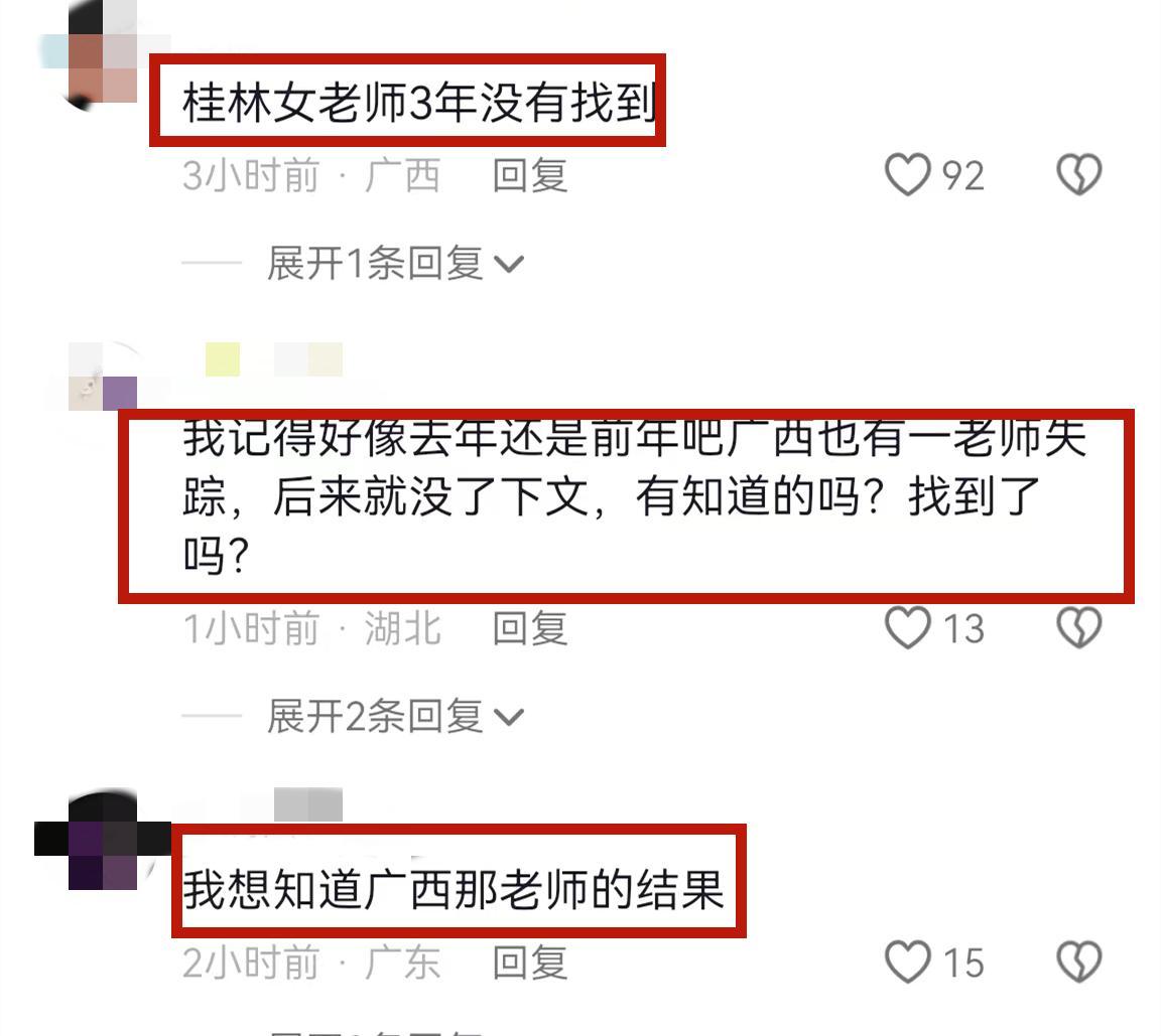2021年,廣西桂林的一名王姓女老師騎着電動車去學校上課,也是在半路失蹤了,至今下落不明。