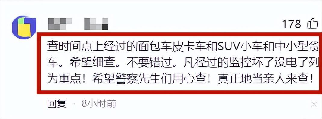 有網友建議要嚴查事發當天女老師上班路段的麪包車、皮卡車、SUV小車,中小型貨車,該網友特意強調監控壞了,沒電的地方爲重點。
