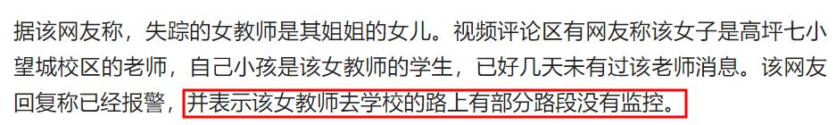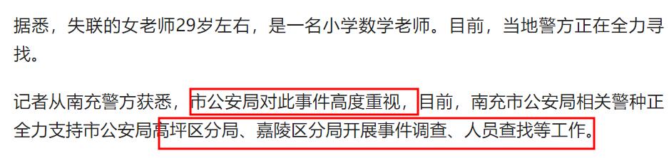 根據這位親戚的描述可知失蹤的女老師今年20多歲,已經結婚,有孩子,她在南充高坪區第七小學望城校區擔任數學老師。4月17日,該女老師騎着摩托車去學校上班,但在路上失蹤了,目前人沒有找到,摩托車也沒找到。