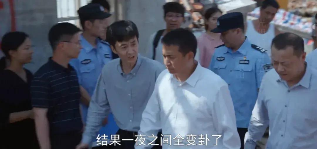 黃磊一出場,就挺着個大肚子,在衆人的簇擁下沉着臉去拆遷現場“視察救場”。