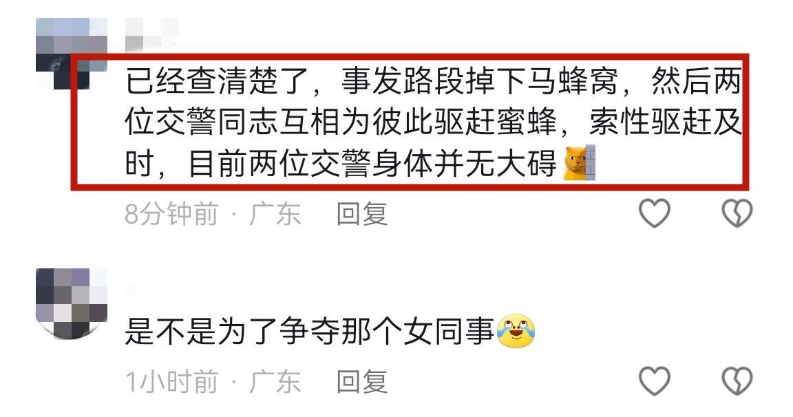 有網友說事發路段掉下馬蜂窩,2名交警互相爲彼此驅趕蜜蜂,好在驅趕及時,2名交警身體並無大礙。