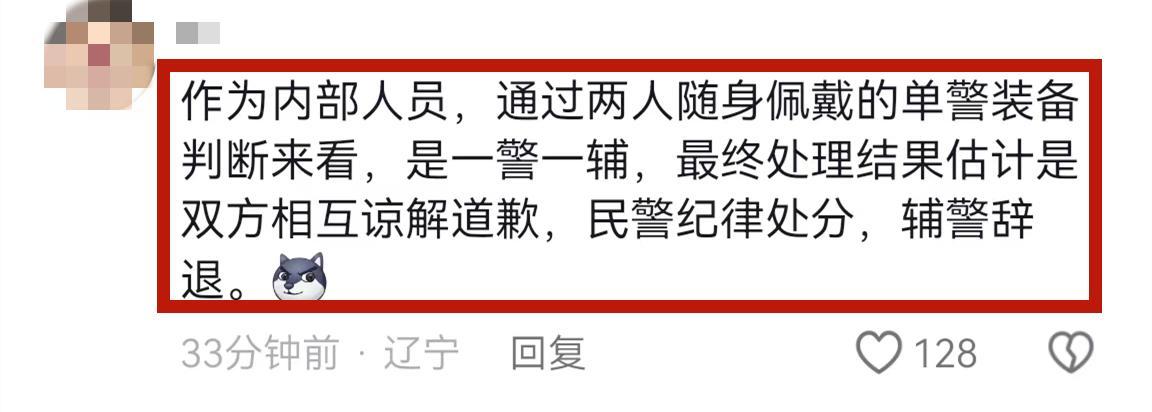 有交警系統的網友表示他通過兩人隨身佩戴的單警裝備判斷,兩人是一警一輔,該網友猜測最終的處理結果是雙方互相諒解道歉,民警紀律處分,輔警被辭退。