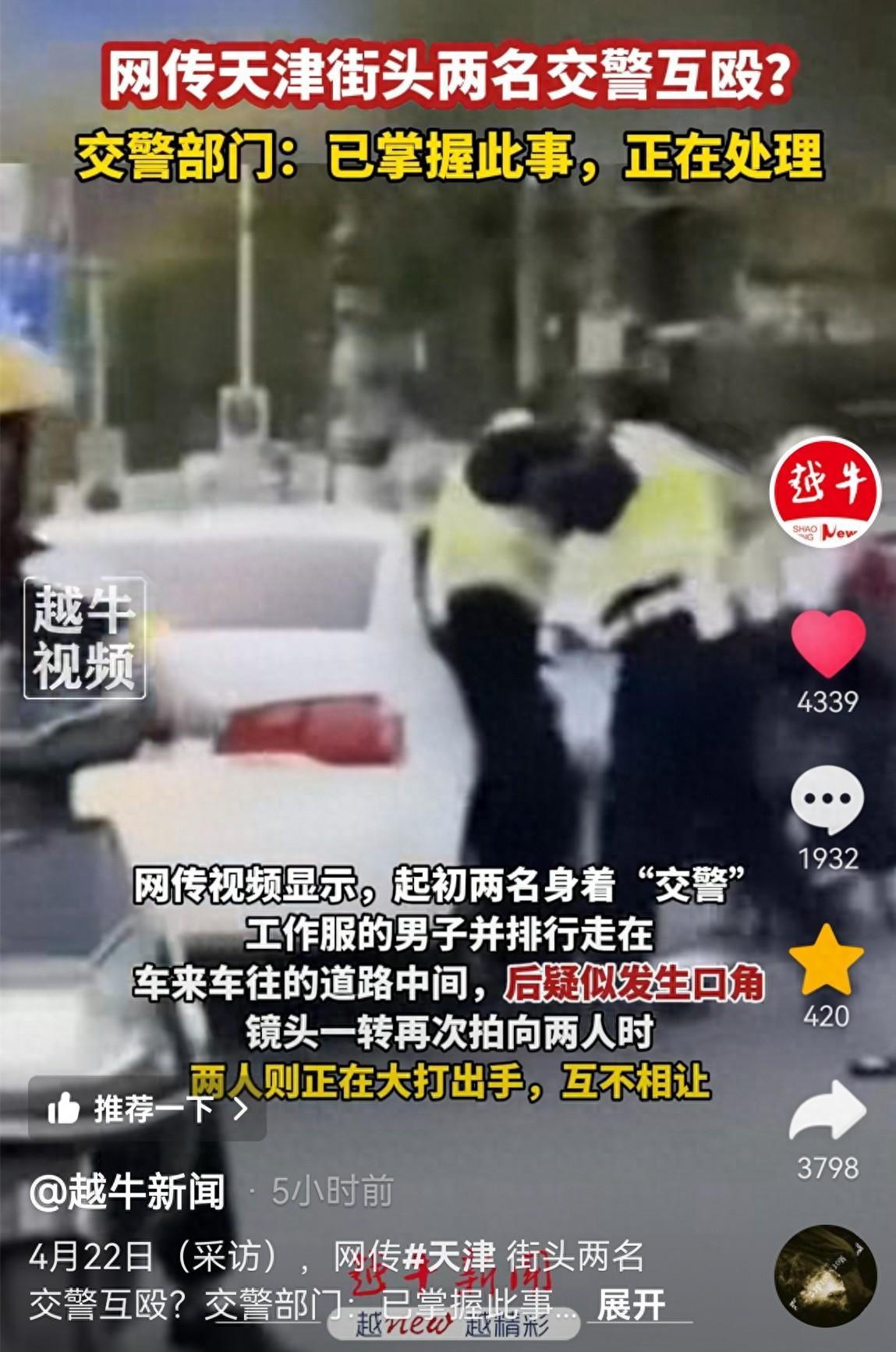 4月22日,一段2名天津交警在街頭打架鬥毆的視頻在網絡瘋傳。