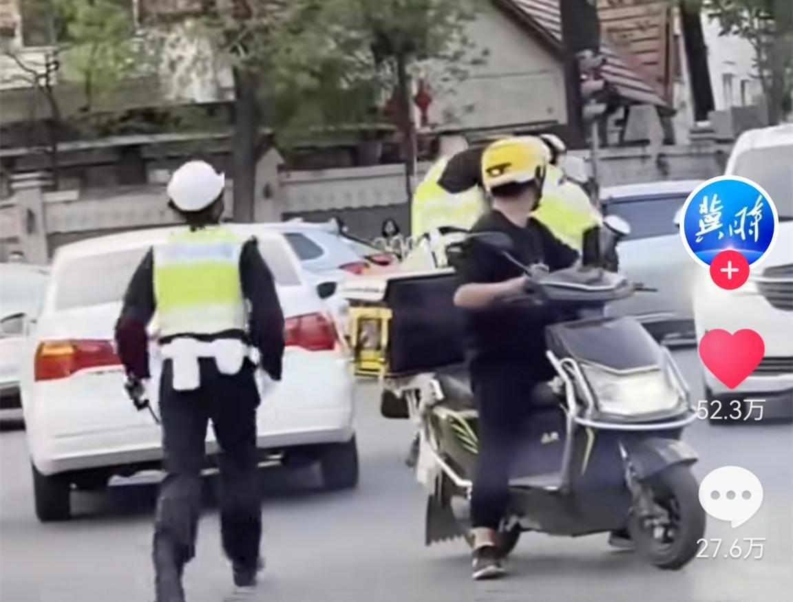 交警當街打架這樣的場面十分罕見,因此他們2人打架引起了很多路人圍觀,其中一名外賣小哥也不怕送外賣超時了,他停車看熱鬧。