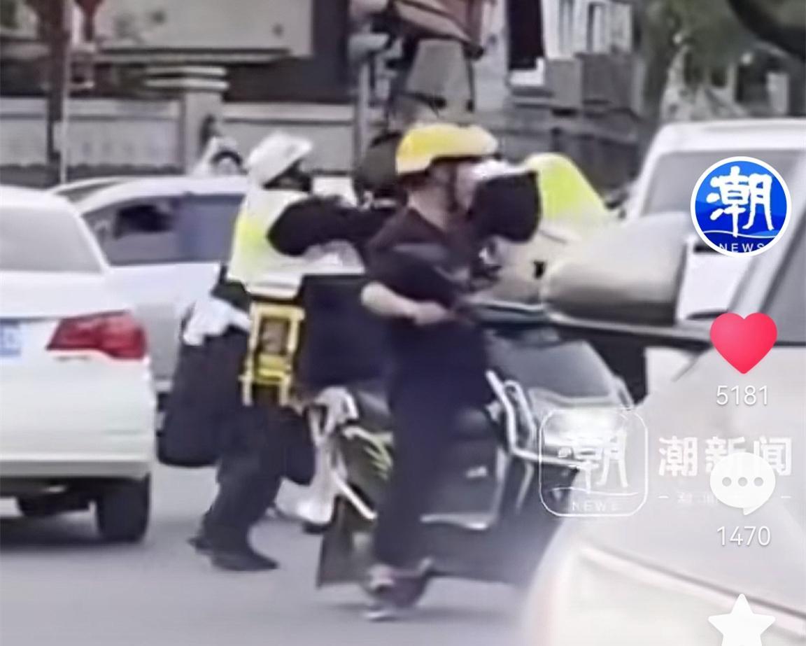 與外賣小哥淡定看熱鬧相比,離2名交警最近的一名騎電動車的女子就不淡定了,2名正在打架的交警離她實在太近了,爲了避免被誤傷,她趕緊從電動車下來,稍稍遠離危險之地。