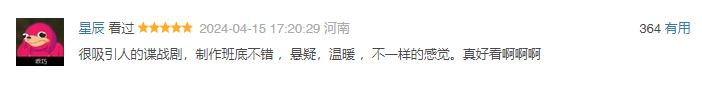 “很吸引人的諜戰劇,懸疑溫暖 ,不一樣的感覺,真好看啊。”