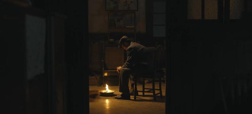 鏡頭從門外照向屋內,畫面的正中間,陳浩獨自一人孤獨坐在椅子上。