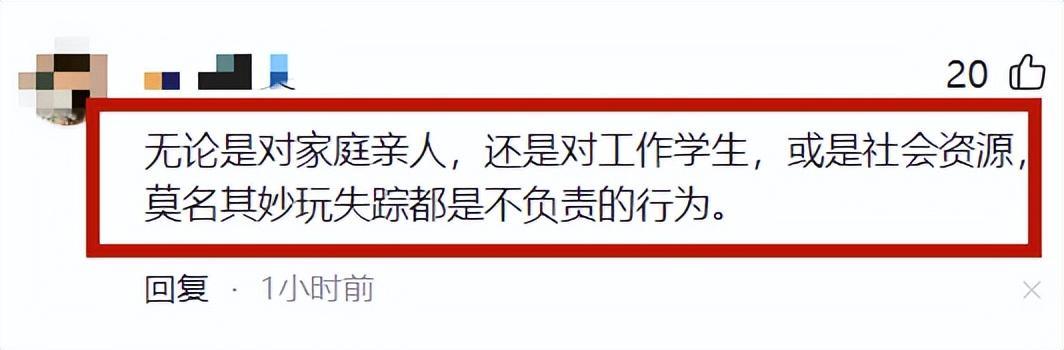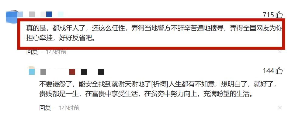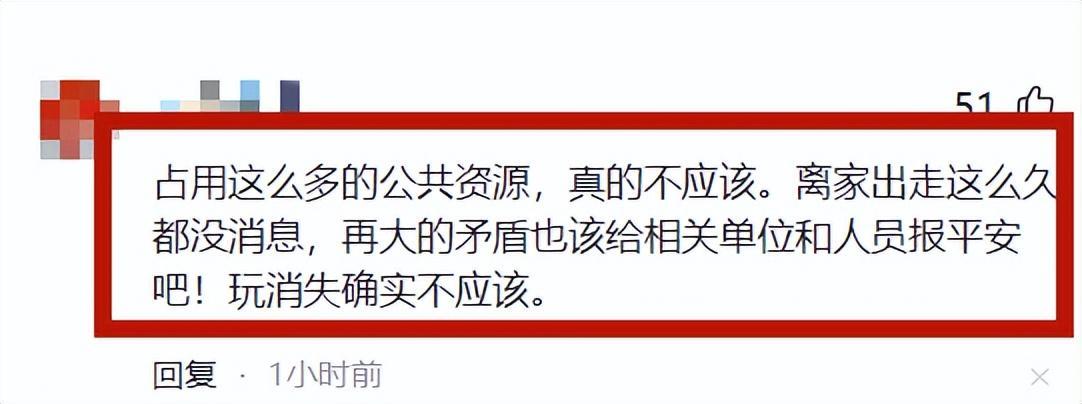 有網友說伍某作爲成年人,太任性了,她玩失蹤,讓當地警方辛苦尋找,讓全國網友爲她擔心牽掛,該網友直言她應該好好反省。