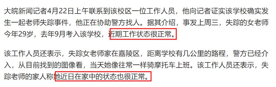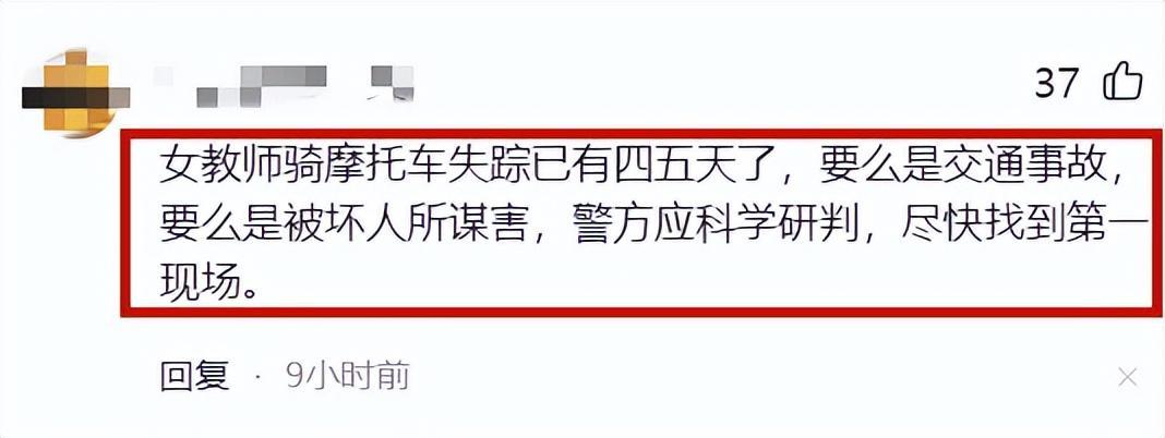 根據女老師親屬的爆料和媒體的報道,女老師是在4月17日失蹤的,事發當天她騎着摩托車去學校上課,然後人就失蹤了。