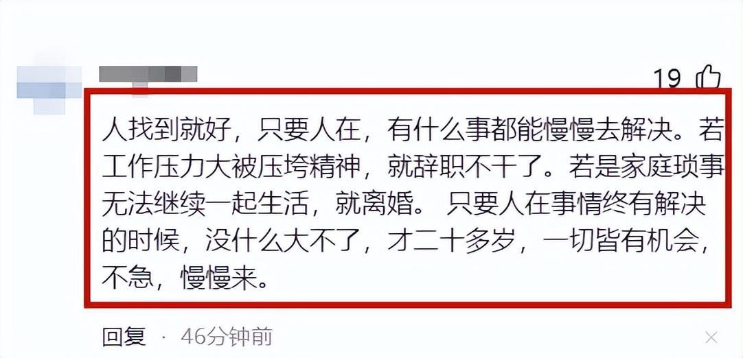 還有網友直言如果工作壓力大,壓垮了精神,就辭職不幹了。如果是因爲家庭瑣事無法繼續一起生活,就離婚。該網友說只要人在,什麼事情都可以去慢慢解決。