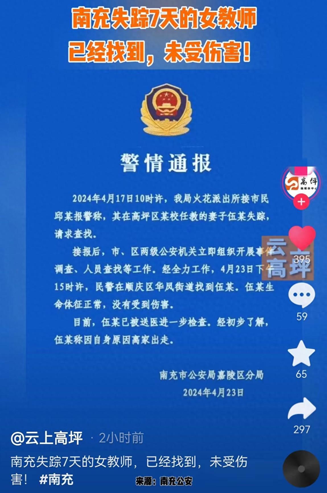 4月23日下午,南充警方發佈了針對女老師失蹤一事的警情通報。
