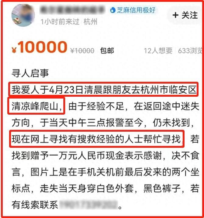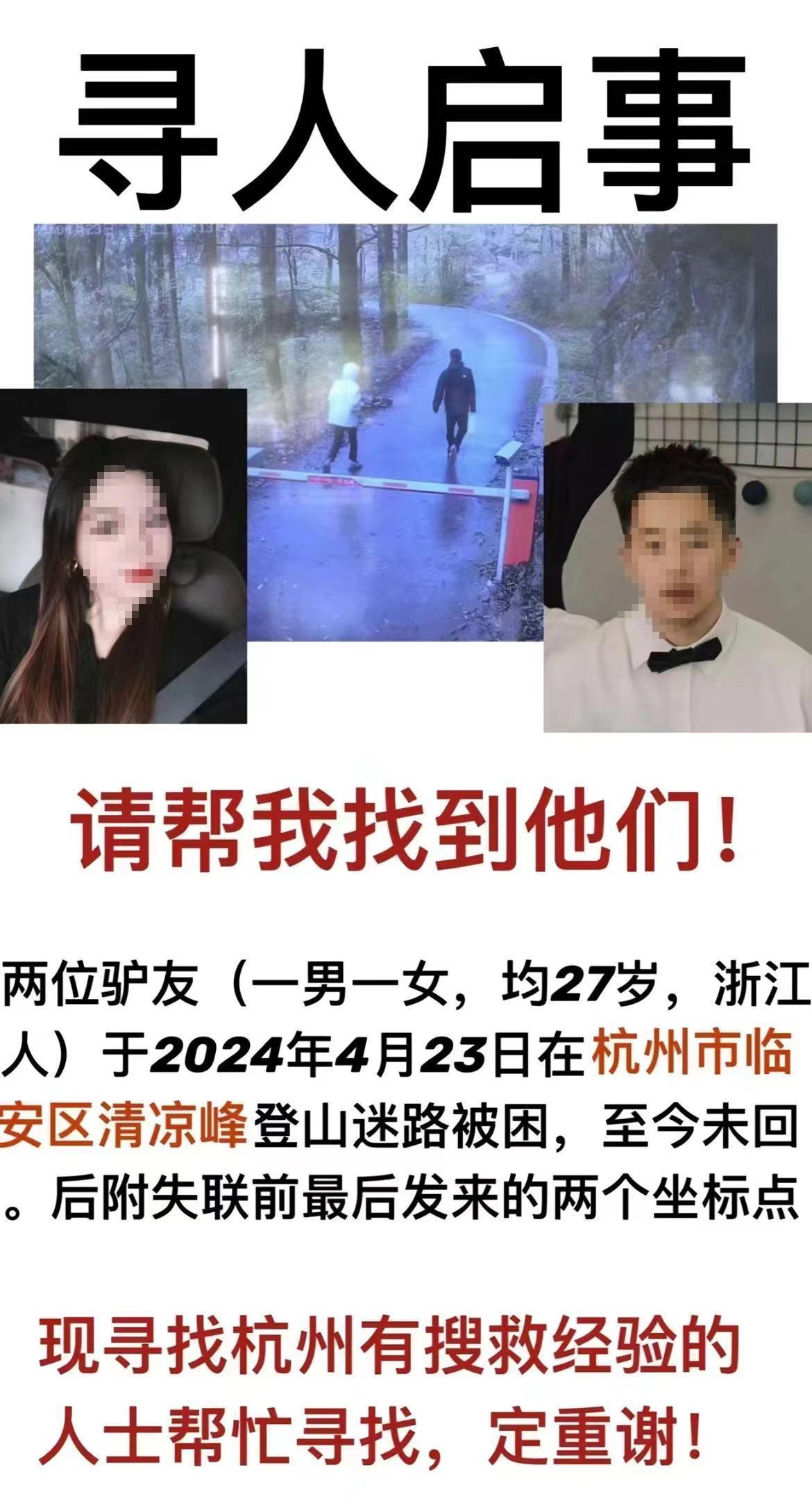 4月24日,杭州的朱先生在網上發文求助,他說他的妻子跟朋友于4月23日清晨一起去杭州臨安區清涼峯爬山,但由於經驗不足,在返回的路途中迷失方向,他在當天下午3點不得不報警,但截止發佈求助信息,妻子還沒有找到。