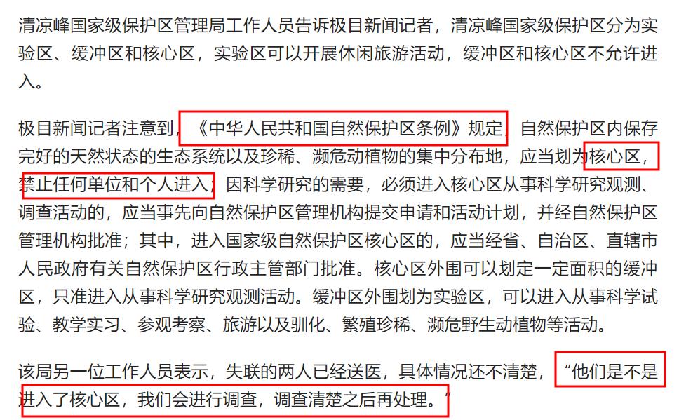 那麼朱先生的妻子和同行男子到底有沒有進入清涼峯保護區的核心區呢?清涼峯保護區管理局的工作人員回應媒體稱“他們是不是進入了核心區,我們會進行調查,調查清楚之後再處理。”