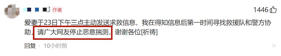 最終,面對網上的這種輿論,朱先生髮文做出了回應,他說妻子在4月23日下午3點主動發送求救信息,他在得知信息後第一時間尋找救援隊和警方協助,“請廣大網友停止惡意揣測,謝謝各位。”
