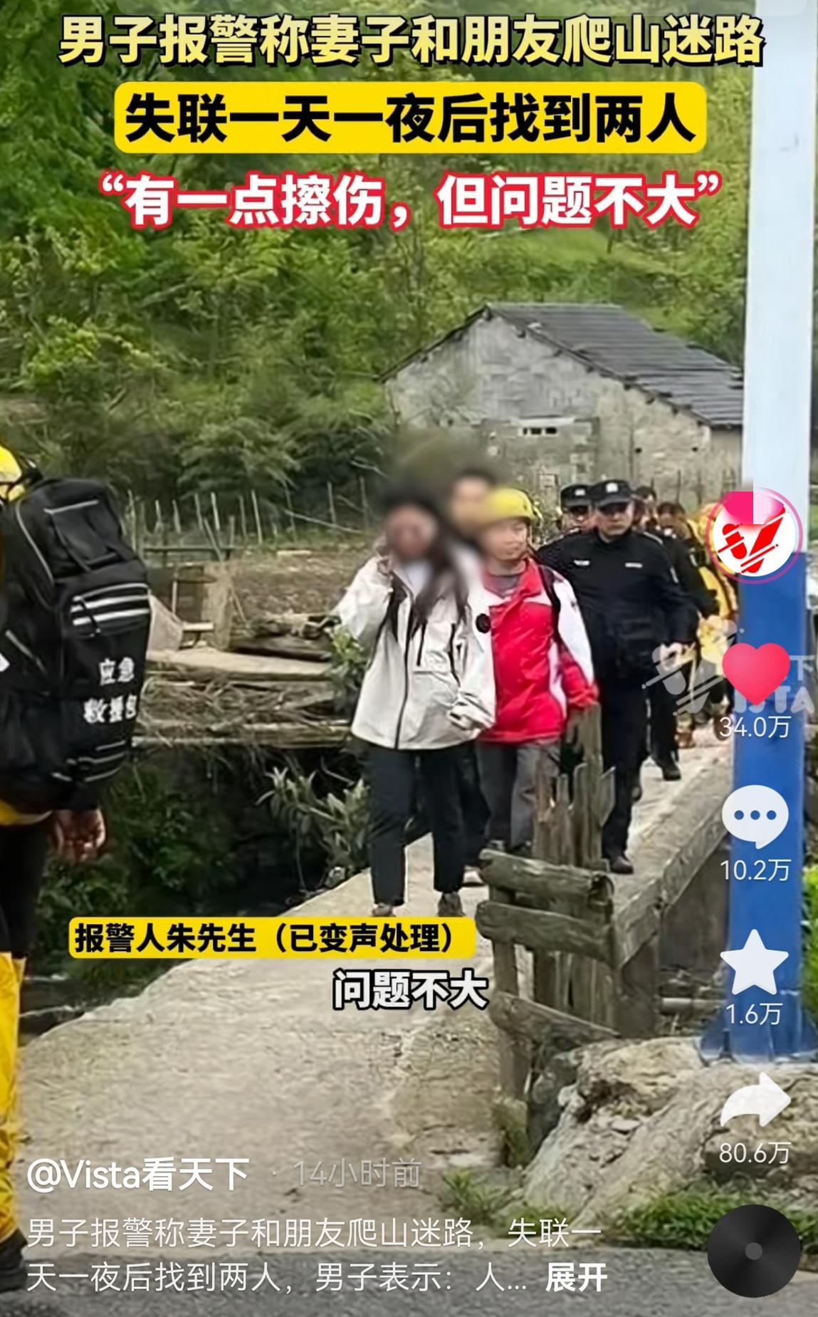 幸運的是,在當地警方、救援隊和村民的積極搜索下,朱先生的妻子和她的朋友于4月25日凌晨找到了。