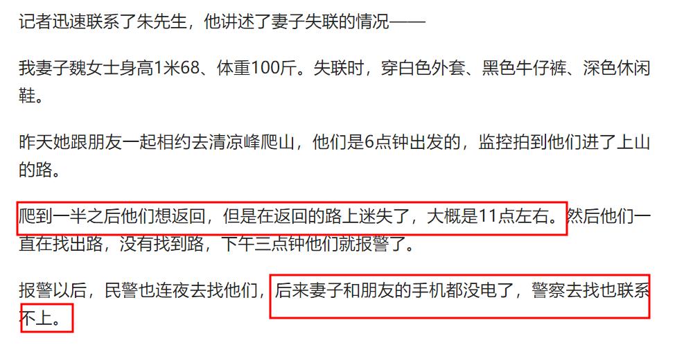 隨後他透露了很多妻子失聯的細節,他說妻子和男性友人爬山爬到一半就想返回,但在返回的路上迷失了,彼時,妻子還通過手機聯繫了朱先生,告知了他迷路的事情。