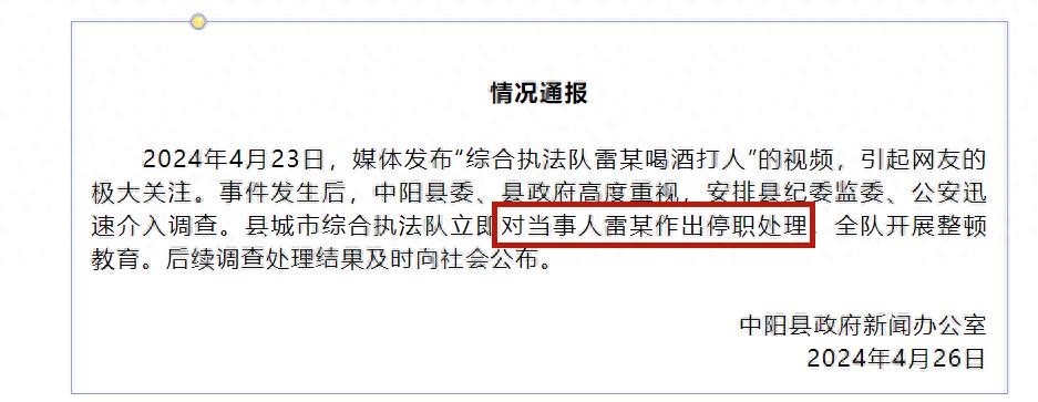 根據通報可知,雷某酒後打人事件發生於4月23日,事情發生後,中陽縣官方非常重視,立即安排紀委監委和公安迅速介入調查。