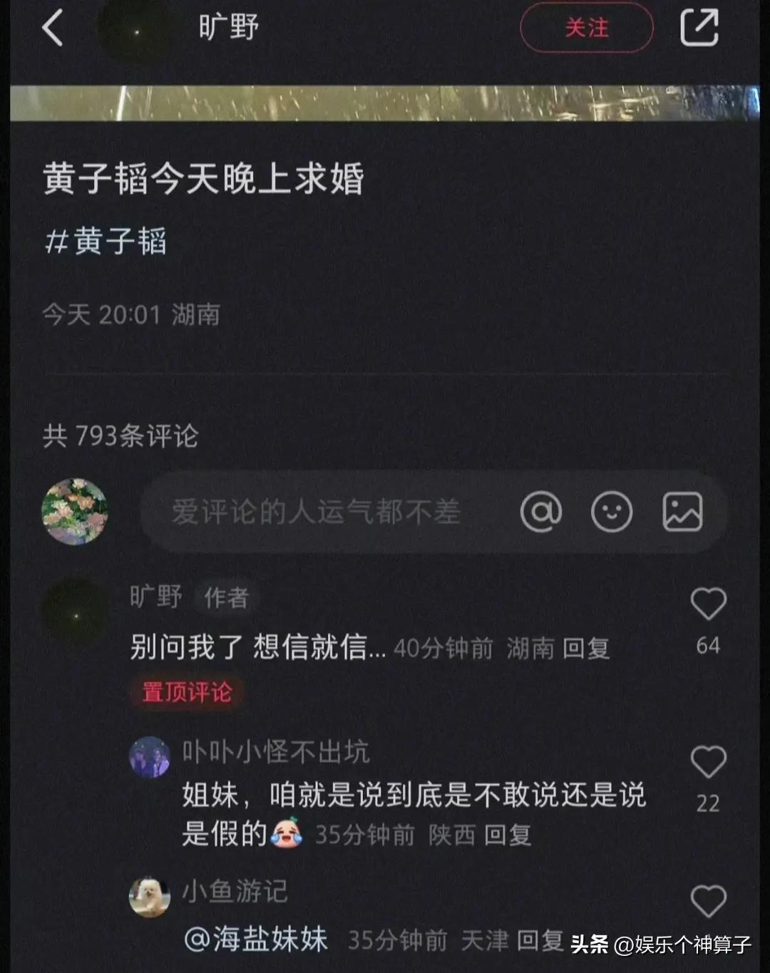 或許兩人真的只是好朋友,黃子韜覺得沒有必要回應,至於網上曝出求婚,確實聽起來有點離譜,可能懶得理睬,不管怎樣,把事情講明白還是有必要的,既可以解除網友的疑惑,也可以讓粉絲安心。