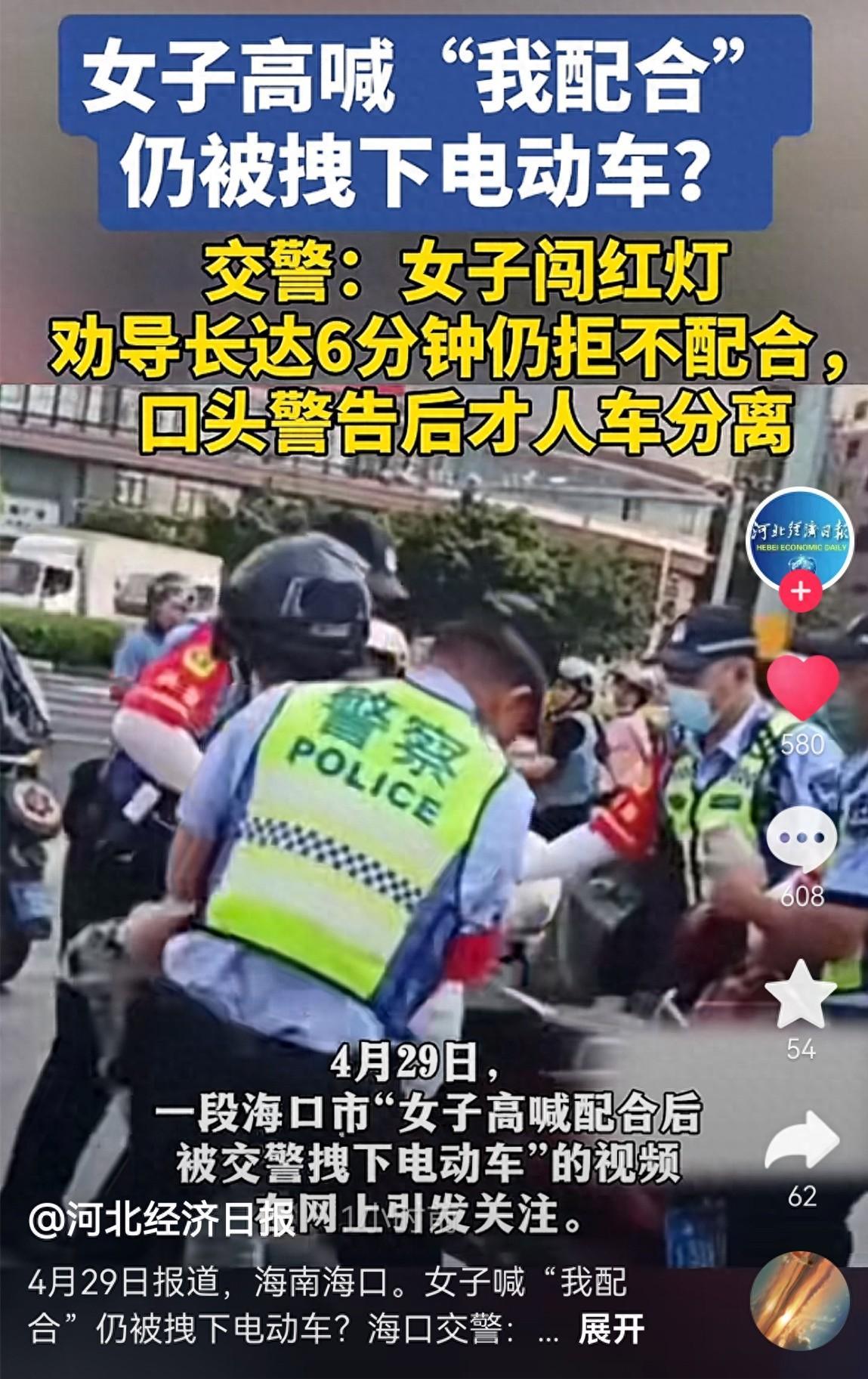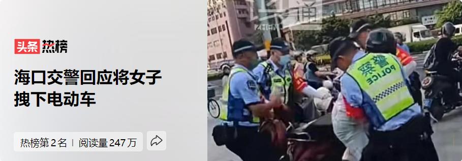 4月29日,海口交警將一名女子拽下電動車的事件登上熱搜。