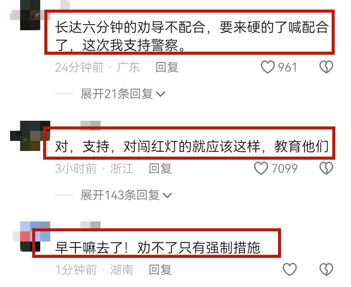 有網友說“像這樣勸導不了的人就該這樣,挺交警。”