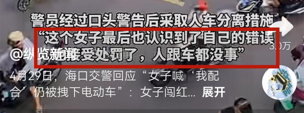 根據海口警方的回應可知,網傳視頻中的女子騎電動車闖紅燈違章,彼時現場交警勸導了6分鐘,但女子拒不配合,最後海口交警在對女子進行口頭警告之後,採取了人車分離措施。